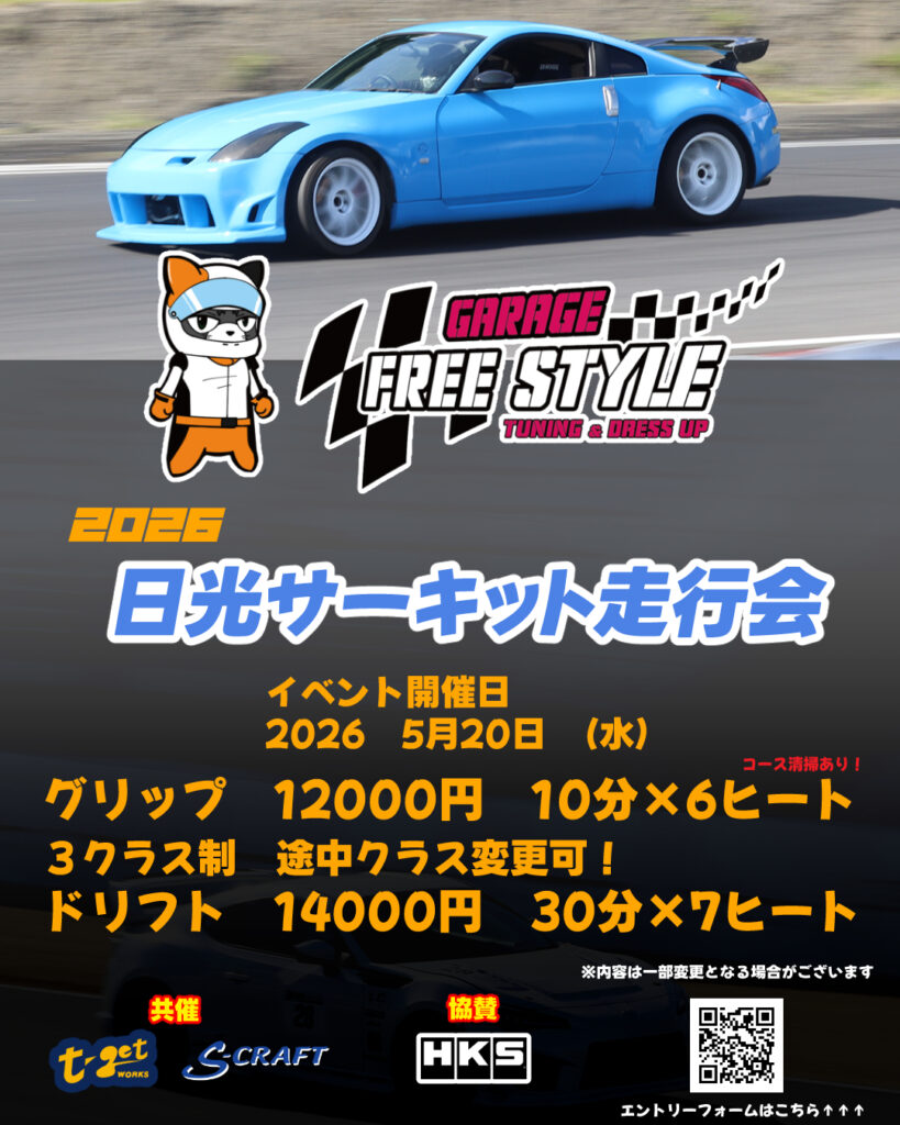 栃木県にある日光サーキットを一日貸切っての走行会となります。ドリフト・グリップの両クラスがありドリフトはビギナークラスもあります。当走行会は初~中級者向けの走行会として開催していますので運営スタッフも丁寧な対応を心掛けております。